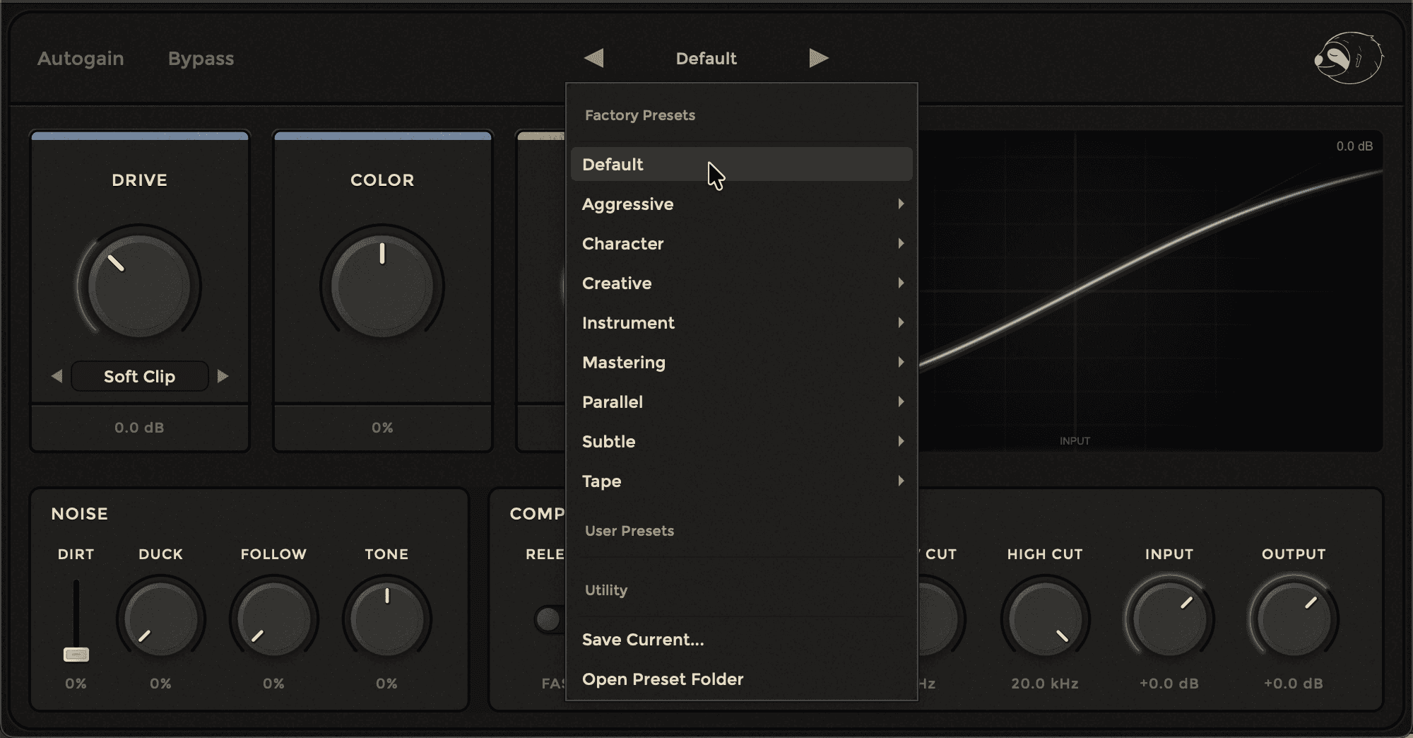 In the top left you will find the "Autogain" toggle, which when enabled automatically compensates for volume changes caused by the saturation — this allows you to push the drive without the signal getting louder, making it easier to judge the tonal effect rather than just the volume increase.
