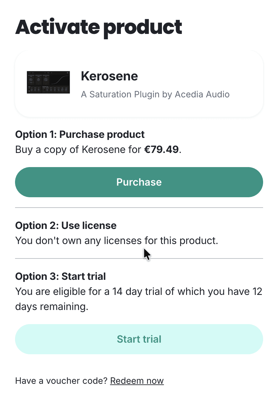 This will bring you to the Acedia Audio website, where you will be asked to sign in if you have not already. After logging in, you will be able to activate your paid license or start a free 14 day trial.